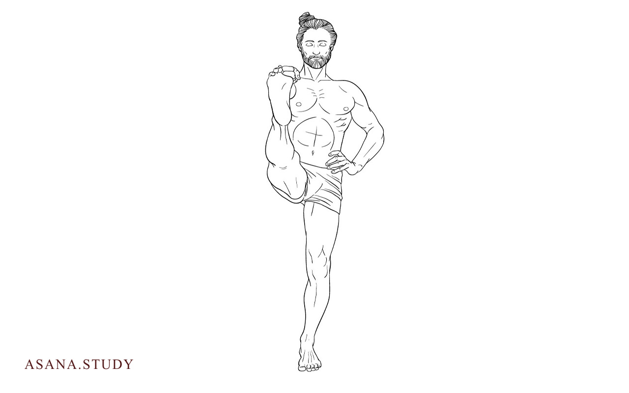 Перевод с санскрита: «Поза вытяжения с рукой, (захватывающей) за палец стопы»